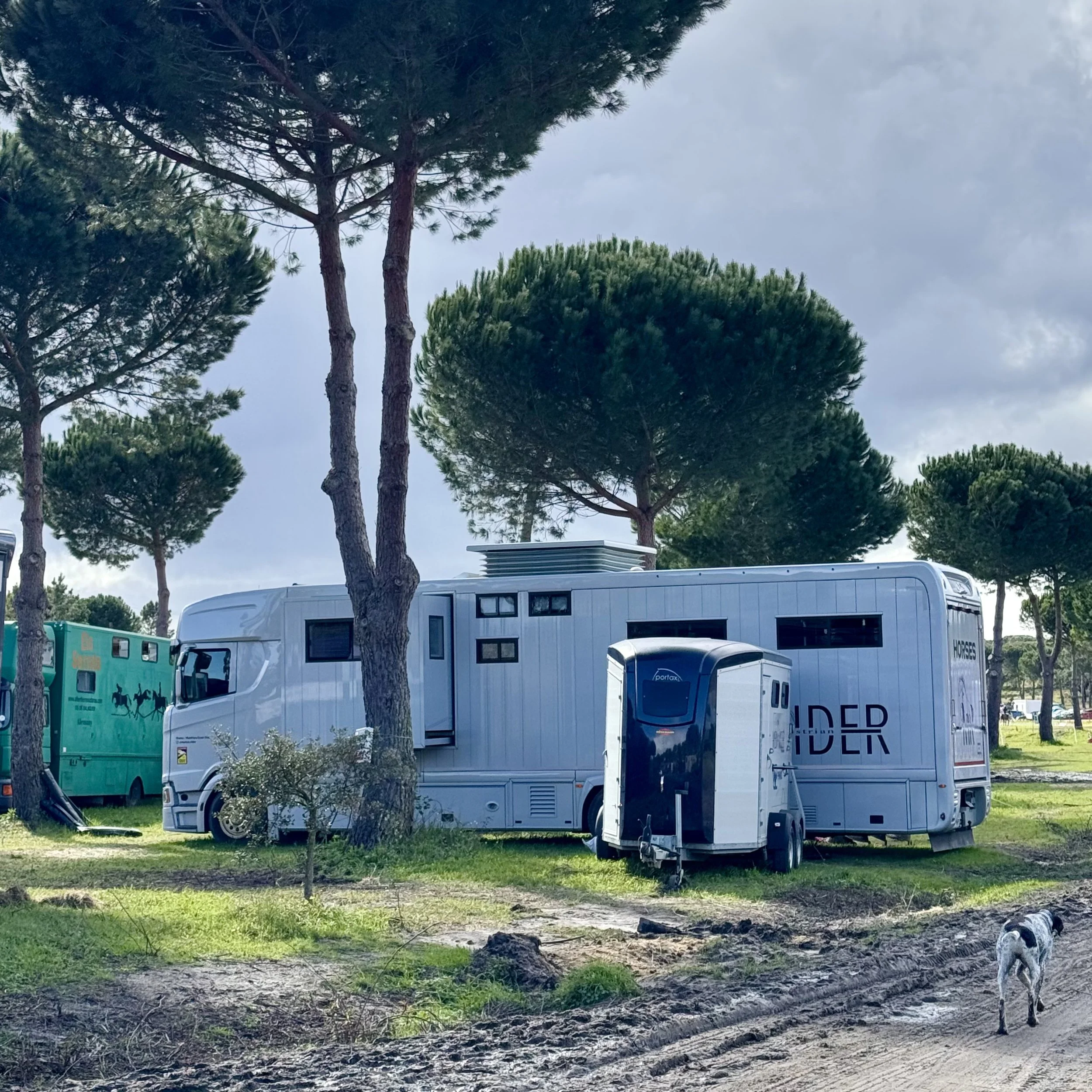 Fueron dos semanas duras, pasadas por agua. El campamento se convirtió en una lucha constante contra el barro. Hubo de todo. Contamos con la ayuda de nuestro nuevo patrocinador, la marca Intacol que estuvo pendiente todo el concurso para proporcionar el mejor pienso y suplementos para los caballos. El camión de Finca Epona pasó a ser un refugio para el equipo de Mateo, con la indispensable ayuda de Andrea para el cuidado de los caballos, y sus padres, Philippe y Leonides.